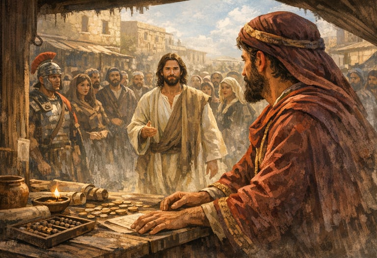 As you get to the tax booth, you see the line already forming with the Roman guards directing traffic. You see the sad and angry looks on the faces of the people lining up. You see one of your old classmates at the front of the line. “Traitor!” he yells at you. You want to argue, but you agree with him. You have sold your soul. Was it to money, or was it to Rome? I guess it no longer matters — you’re stuck now.